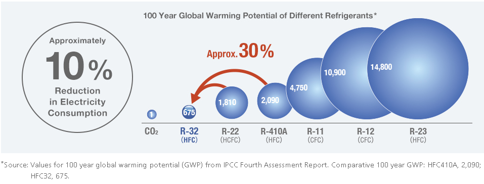 Strategií společnosti Daikin je nahradit chladivo R410 novou generací chladiva R32 do roku 2019. V roce 2013 vyvinula mateřská firma Daikin v Japonsku první R32 klimatizační jednotku pro Evropu, a poté Daikin v České Republice převzala vztyčený prapor a pokračovala v dodávání nových produktů s tímto chladivem pro rezidenční i komerční segmenty v regionu EMEA. V roce 2017, vývojové projekty R32BOP * a R32 GSI * dále rozšiřují portfolio společnosti Daikin a umožňují tak prodej výrobků šetrných k životnímu prostředí i v rozvojových zemích. Tato část portfolia představuje zónu s velkým objemem, která zvětšuje pozitivní dopad vybraného chladiva na životní prostředí.